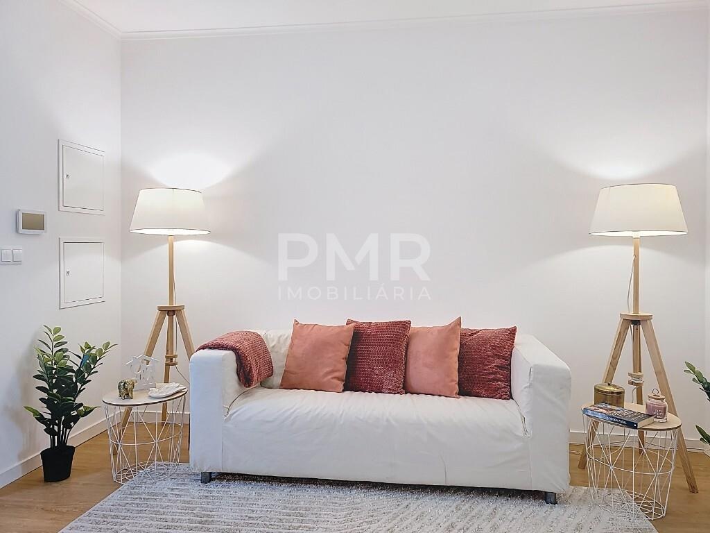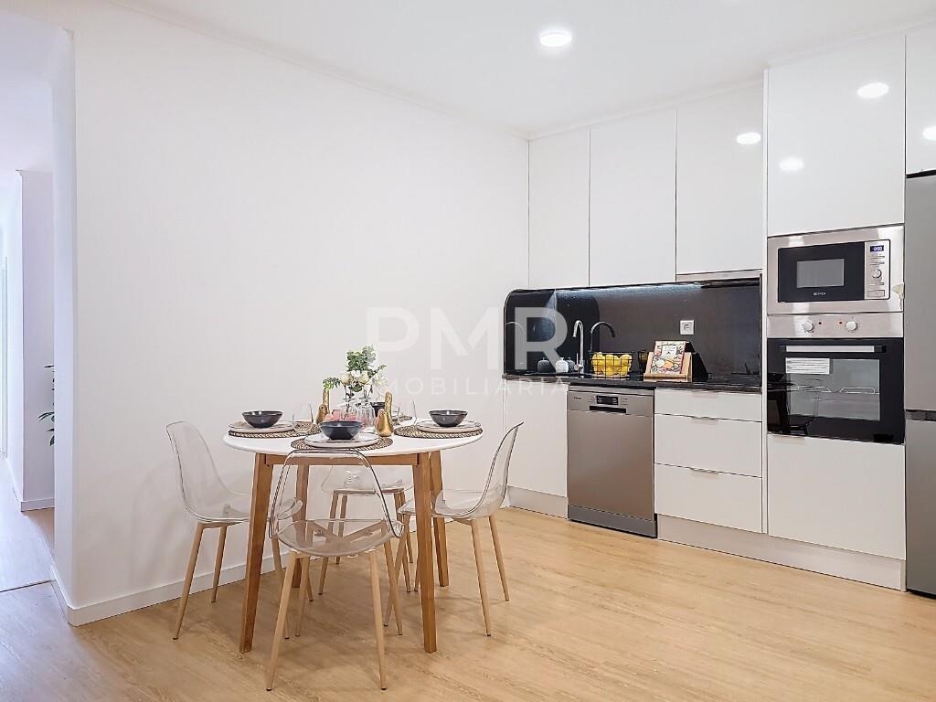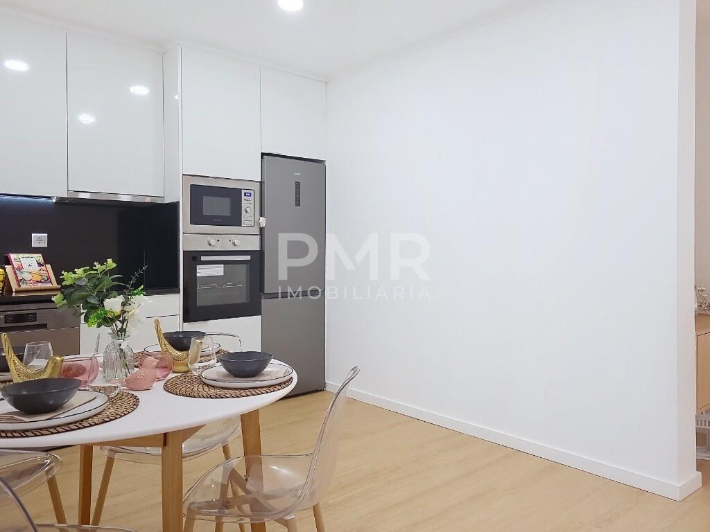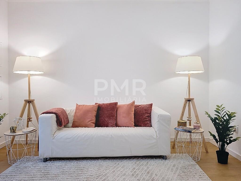 A entrada conduz a uma sala de estar luminosa, decorada em tons suaves e com pavimento em madeira clara, criando um ambiente equilibrado e convidativo. A cozinha em open space, moderna e totalmente equipada, integra-se de forma harmoniosa com a zona de refeições, permitindo um estilo de vida prático e social, perfeito para receber família e amigos.