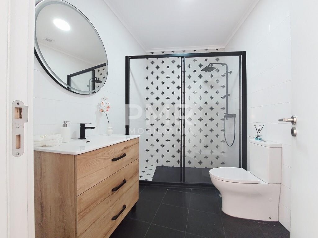 A casa de banho apresenta um design atual, com cabine de duche em vidro e acabamentos que combinam elegância e durabilidade.
